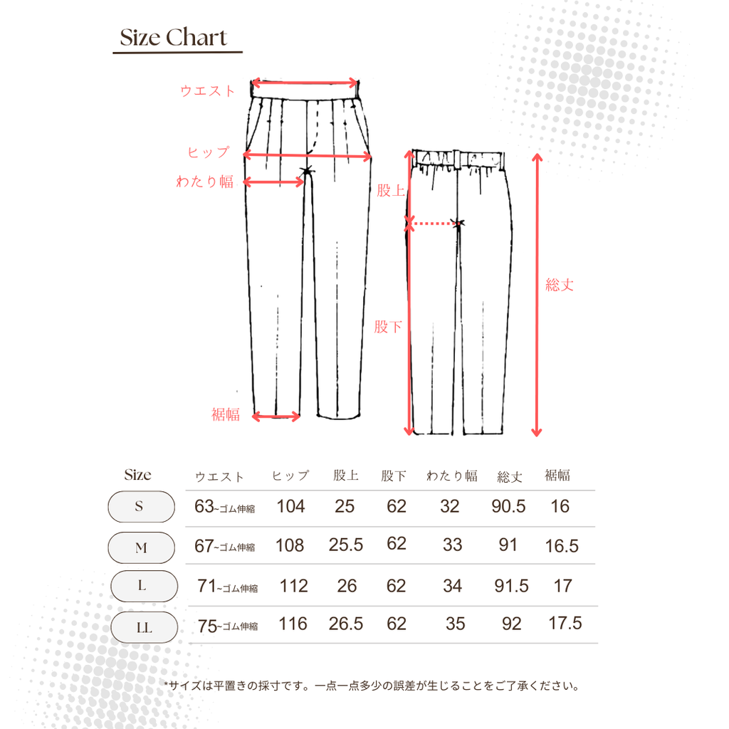 | ウエスト | ヒップ | 股上 | 股下 | わたり幅 | 総丈 | 裾幅 | |